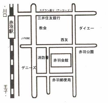 赤羽会館 赤羽南1-13-1 TEL:03-3901-8121(代) JR赤羽駅下車 徒歩5分 地下鉄南北線赤羽岩淵駅下車 徒歩10分 国際興業バス赤羽駅東口下車 徒歩1分 |