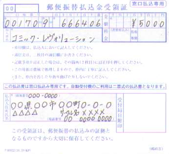 口座番号 00170−9− 666406 加入者名 コミック ・ レヴォリューション 受領書には必ず「サークル名」を記入して下さい。 直接受付会場では現金の受付を行っていません。送金を行ってから窓口までお越しください。